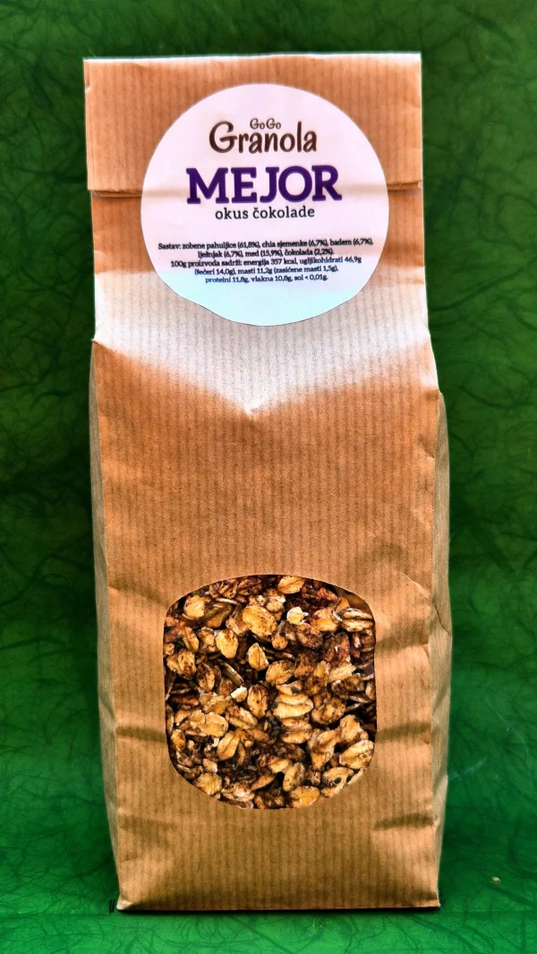 Ova domaća granola, uz cjelovite zobene pahuljice, još sadrži badem, lješnjak i chia sjemenke i med te „začinjena“ je okusom čokolade. Po sastavu vrlo joj je slična granola MEJOR, CEJLONSKI CIMET. Jedina razlika je u okusu. Smisao recepture je isti.
