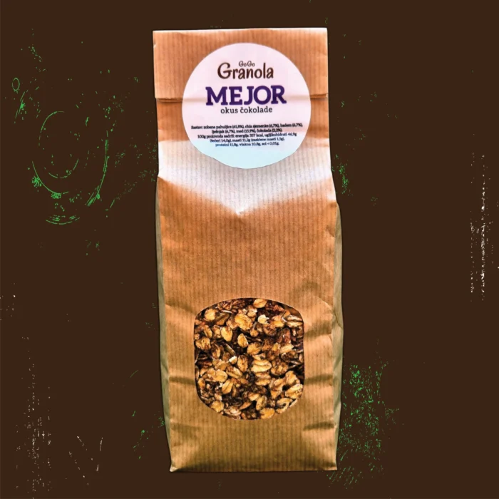 Ova domaća granola, uz cjelovite zobene pahuljice, još sadrži badem, lješnjak i chia sjemenke i med te „začinjena“ je okusom čokolade. Po sastavu vrlo joj je slična granola MEJOR, CEJLONSKI CIMET. Jedina razlika je u okusu. Smisao recepture je isti.